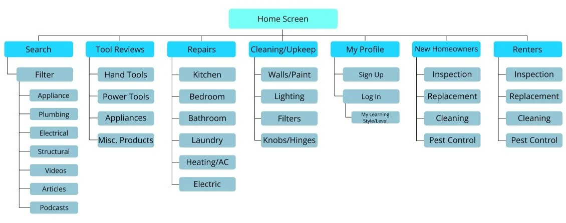 I spent a fair amount of time during my competitive audit scanning existing DIY resources to find out what market gaps I wanted to fill, and what additional services I wanted to provide for my prospective users. I took my findings and used them to create this organized sitemap for my prototype.