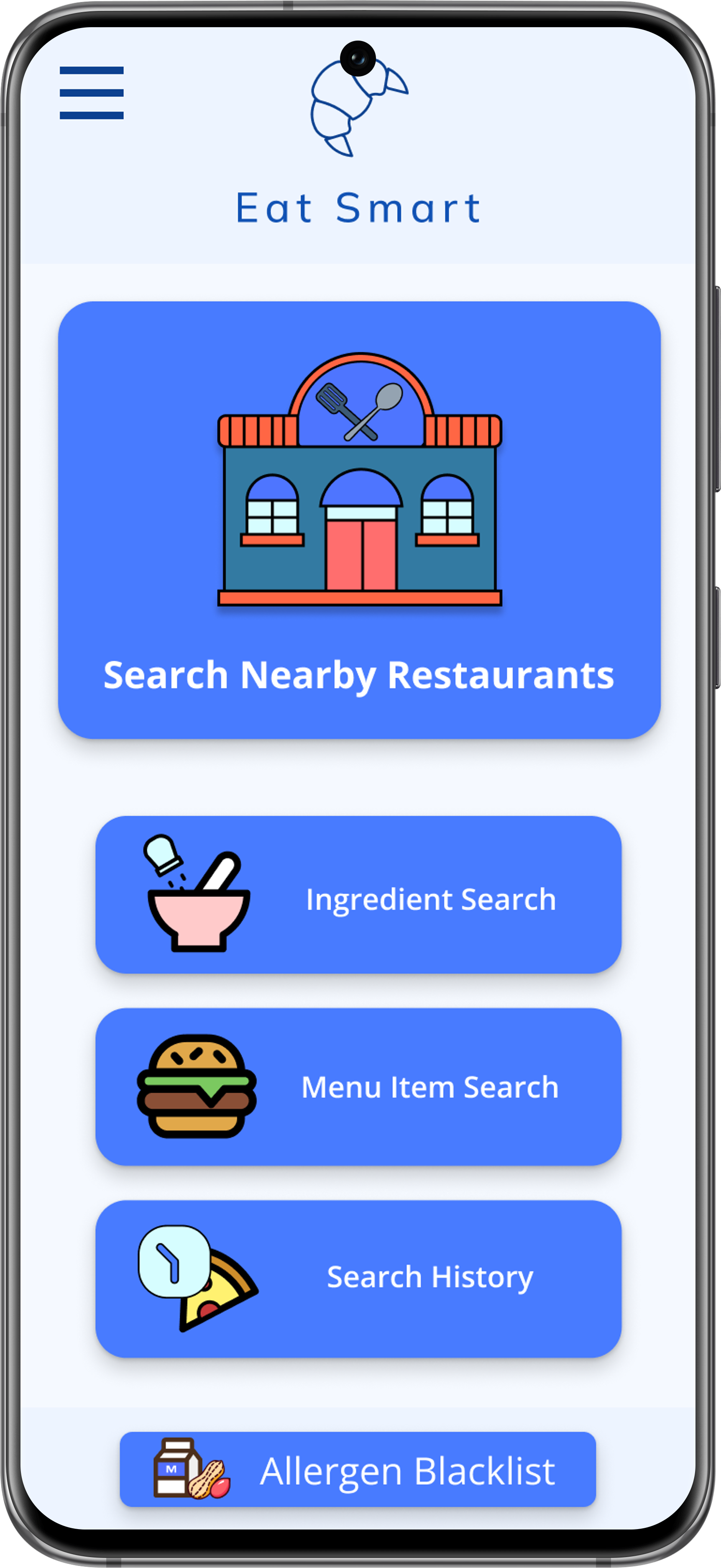 The Solution: Design an app that allows users to search menu items specific to their choice of restaurant. My Eat Smart App contains a searchable database of popular restaurants and a detailed, up-to-date list of the ingredients used in each menu item. It also provides nutrition information, and will be an invaluable tool for users with food allergies, diet restrictions, or product preferences.